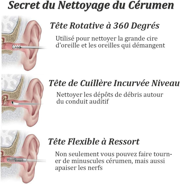 Comparé aux cotons-tiges traditionnels, qui peuvent repousser le cérumen dans l'oreille, notre kit de nettoyage auriculaire présente plusieurs améliorations. Le cure-oreille en forme de cuillère permet d'éliminer le cérumen facilement et efficacement. Le cure-oreille en spirale, quant à lui, soulage les démangeaisons en massant le conduit auditif.